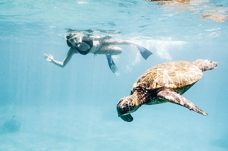 Though sea turtles can be found in many snorkeling/swimming areas on the island, one of my favorites was Maui’s Olowalu Reef. Kayak Olowalu has an excursion where not only can you kayak through the smooth waters, but also pop on a mask to snorkel, and if nature is on your side quite possibly swim with some sea turtles. If you are lucky, a few sharks will be roaming around ready to share your ocean space!