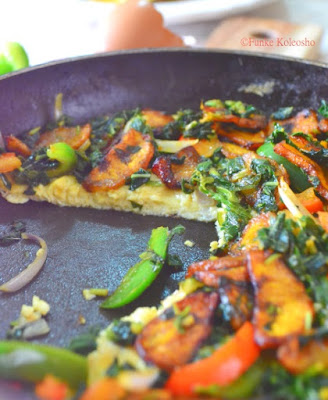 - peppers/onions and the fried (or boiled) plantain slices such that the egg acts like a pizza base. Allow all to heat through. Slice and serve, Excellent eaten hot or cold.