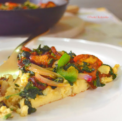 - peppers/onions and the fried (or boiled) plantain slices such that the egg acts like a pizza base. Allow all to heat through. Slice and serve, Excellent eaten hot or cold.