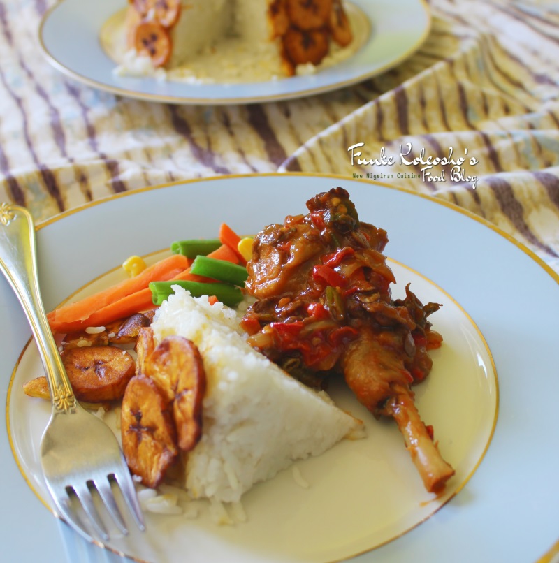 - Then when the rice is cooked, scoop a generous amount into the bowl, already containing the arranged plantain discs. Push down on the rice as you go along to ensure the rice grains come together and take the shape of the mold.